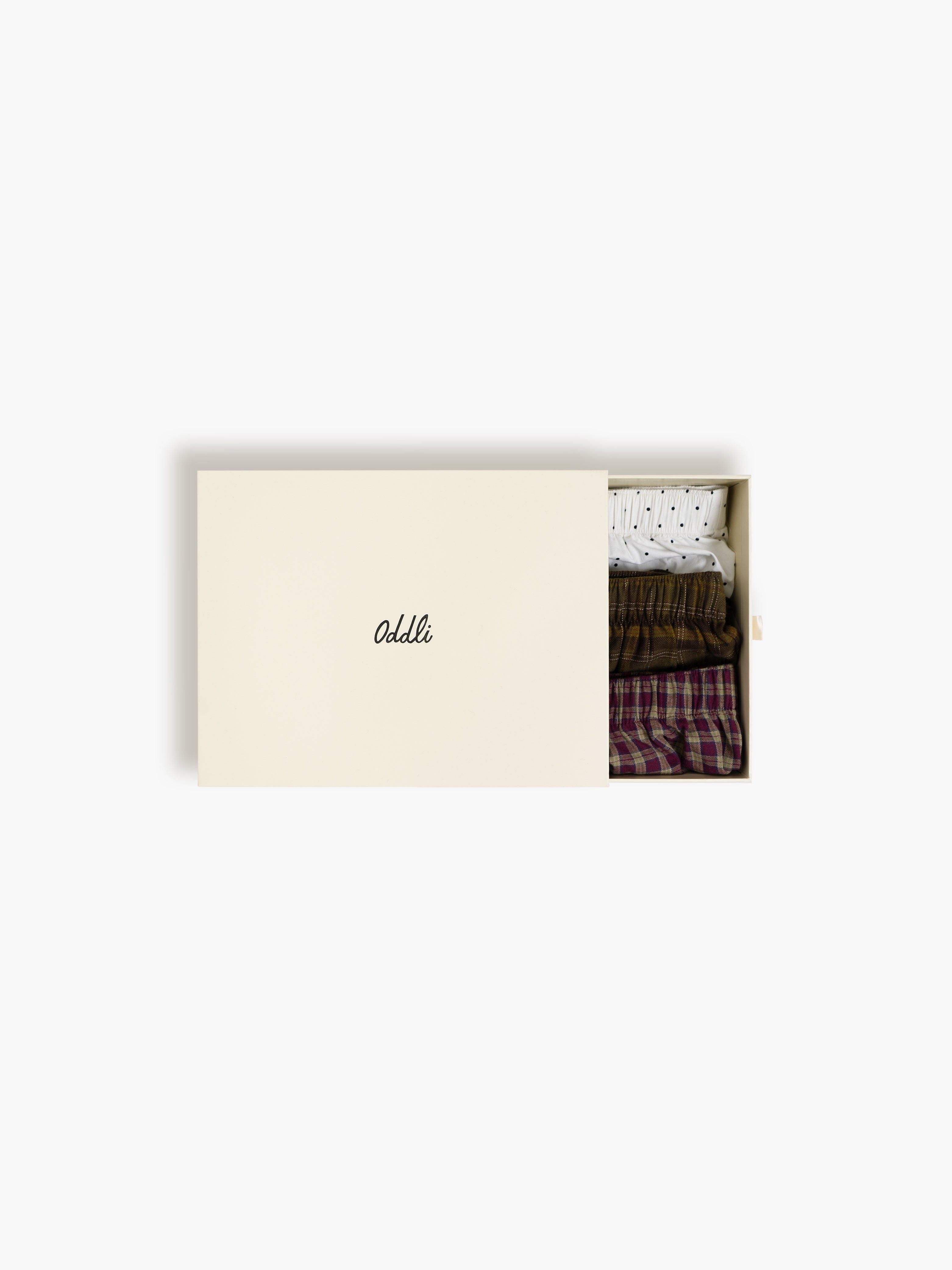 Limited edition pack includes two brand new prints - Green Plaid in an Organic Cotton flannel, and Polka dot in a lightweight Cotton Poplin. The pack is completed with our bestselling Burgundy Plaid in the Organic Cotton flannel.