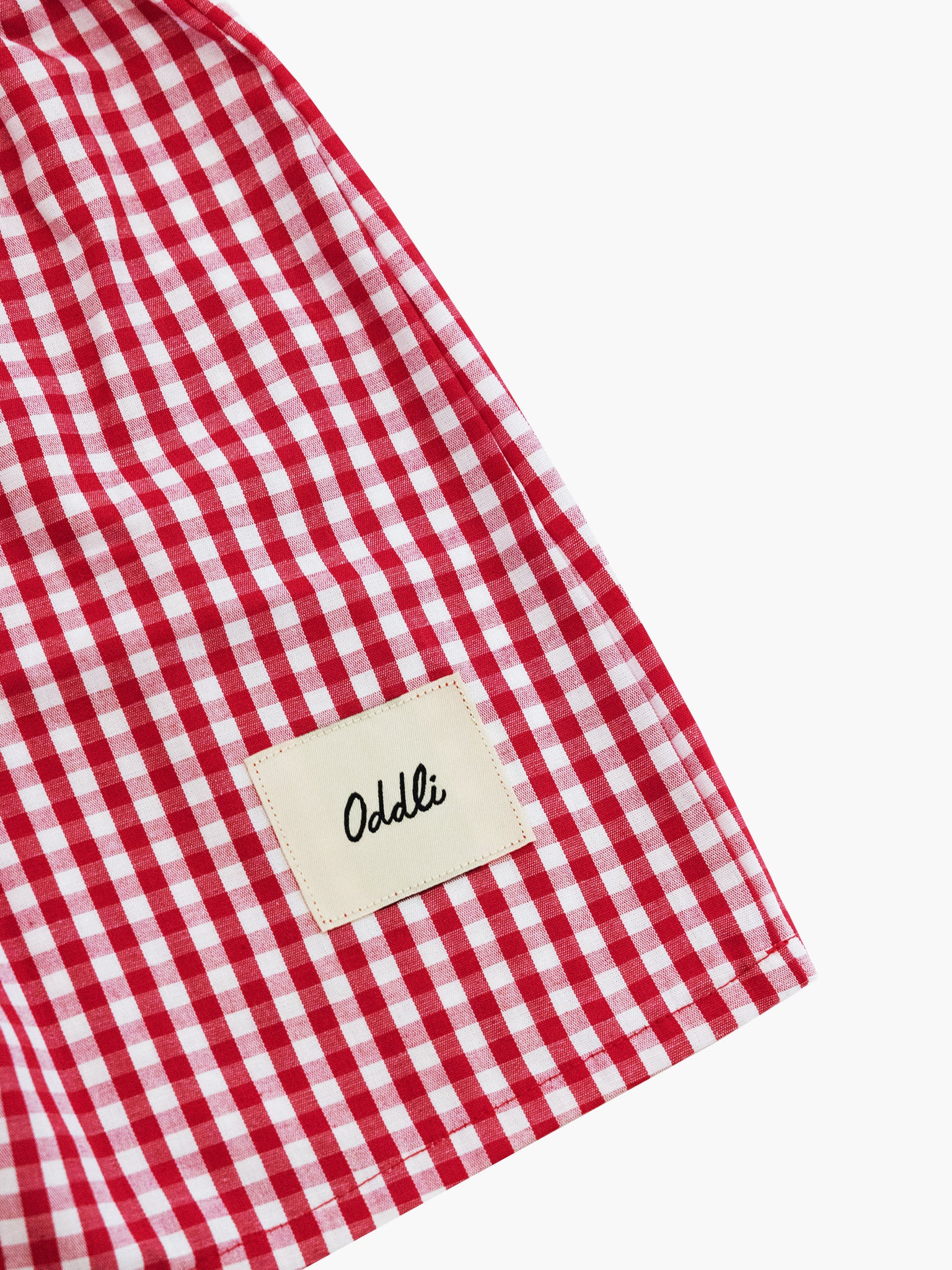 Mia wears size XS/S in Blue and Green Stripe. Sylvie wears size L/XL in Red Plaid. Sophia wears size XS/S in Red Gingham.