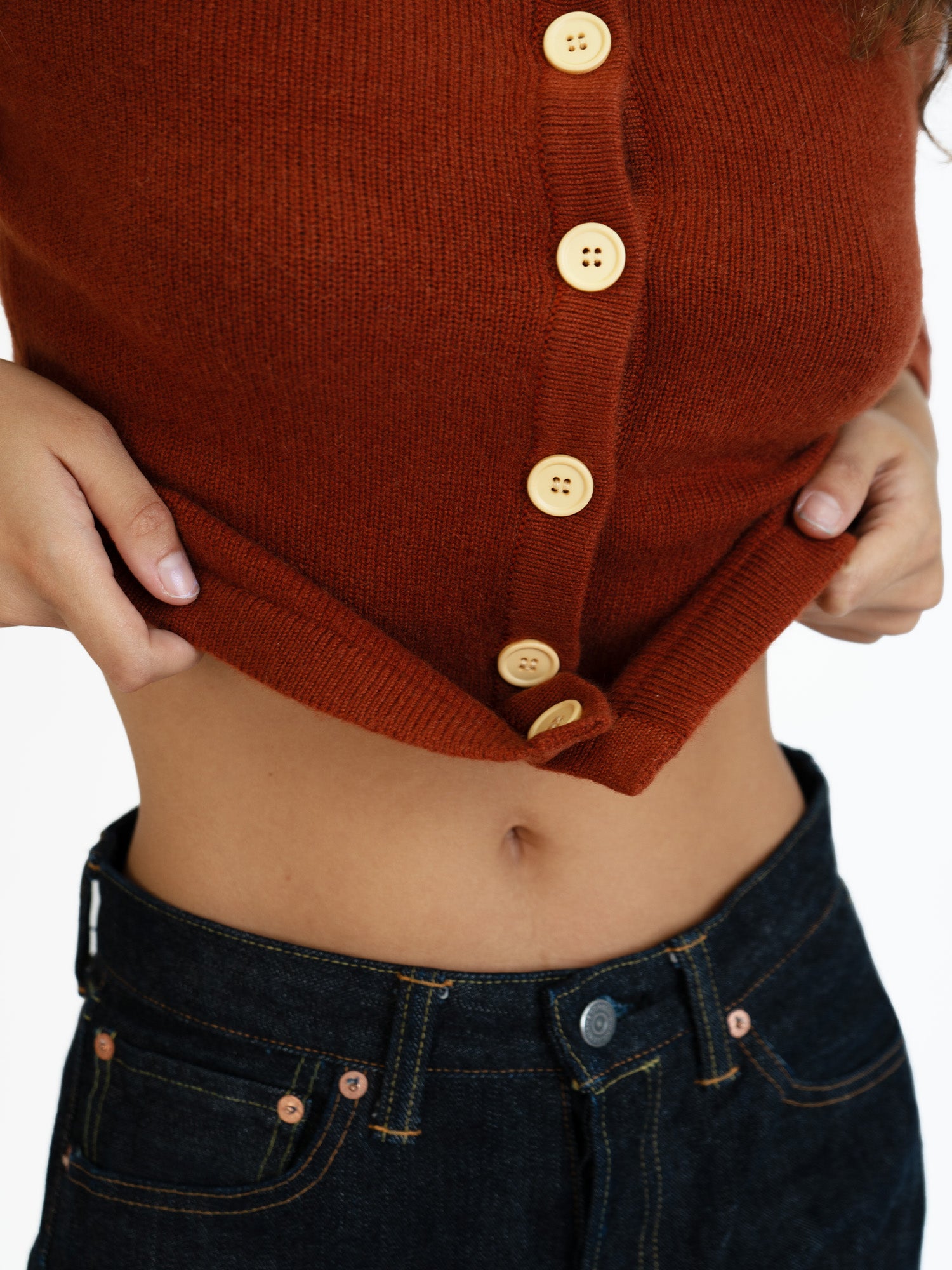 This cardigan is made of 100% Cashmere and has 6 custom Oddli Buttons with a spare button included