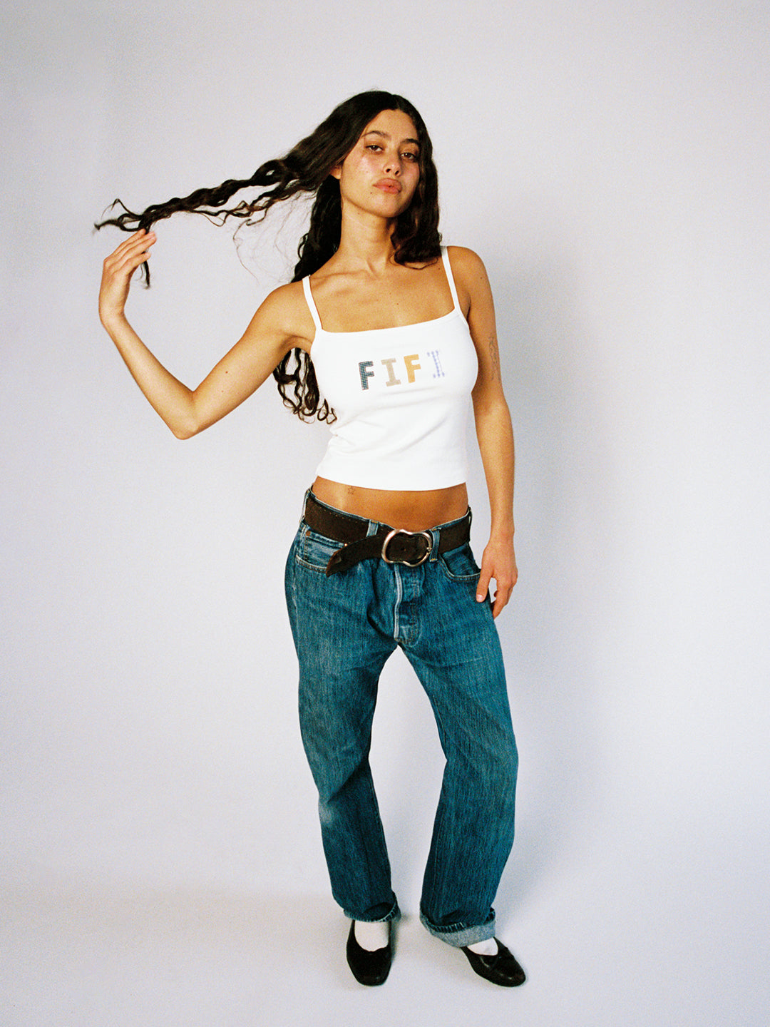 Shirts are cut and sewn in Los Angeles from the best quality organic cotton spandex blend that we made just for these tops. Letters are deadstock and every shirt is one of one.