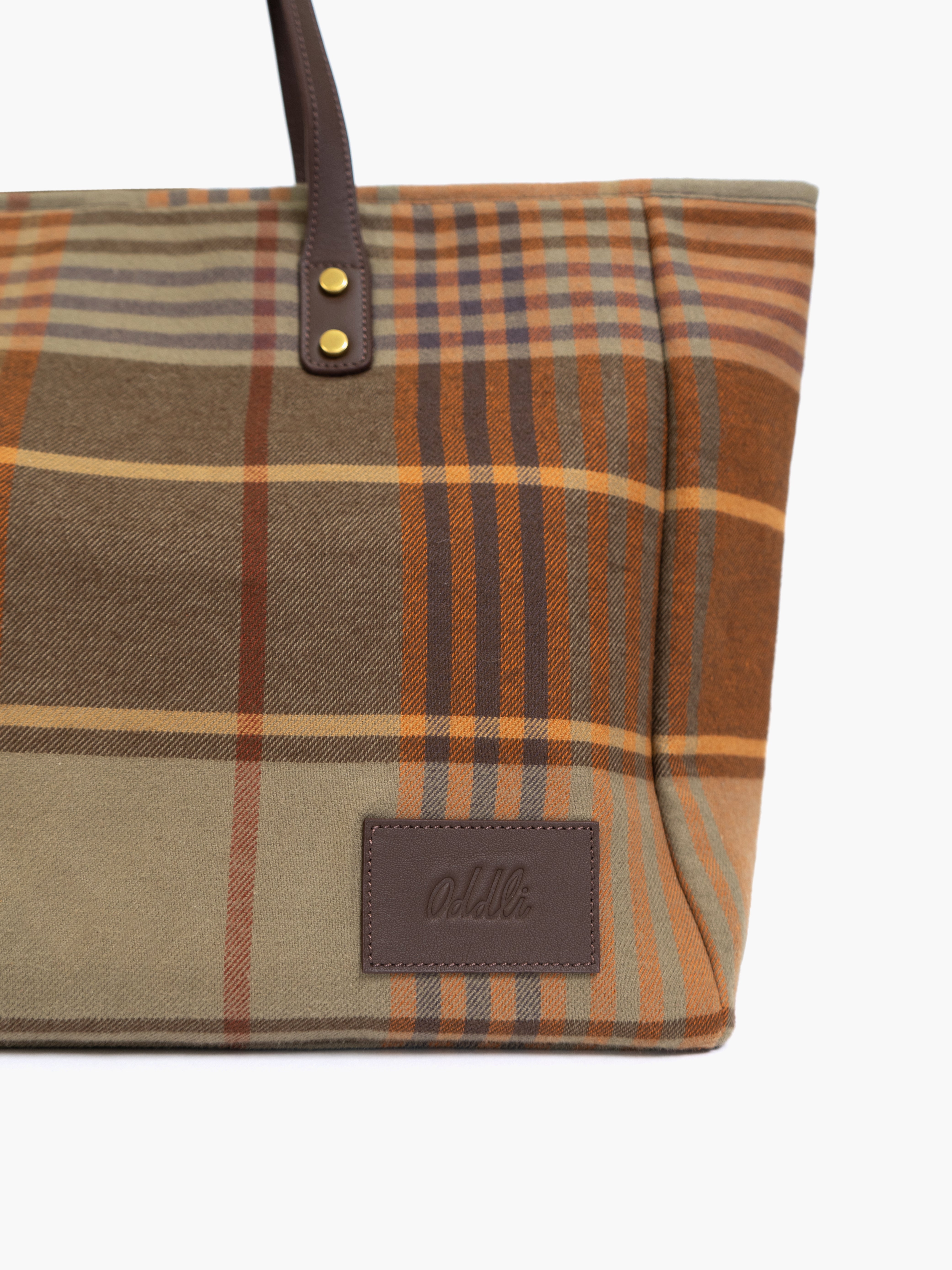 We wanted to design a high quality, timeless bag for every occasion.  Elevated enough to carry as a work bag or for a night to impress. Start the day with your Oddli plaid bag at work, then transition it out to a dinner with friends, or even use it as an ideal weekender bag. It will fit everything and more. The inside is lined, complete with a zipper pocket for valuables, two additional internal pockets for organization, and a magnetic closure for safe keeping. The outside of the bag also has one external pocket. Oddli custom plaid on thick plaid organic cotton, made with real leather straps, and metal brass finishings.