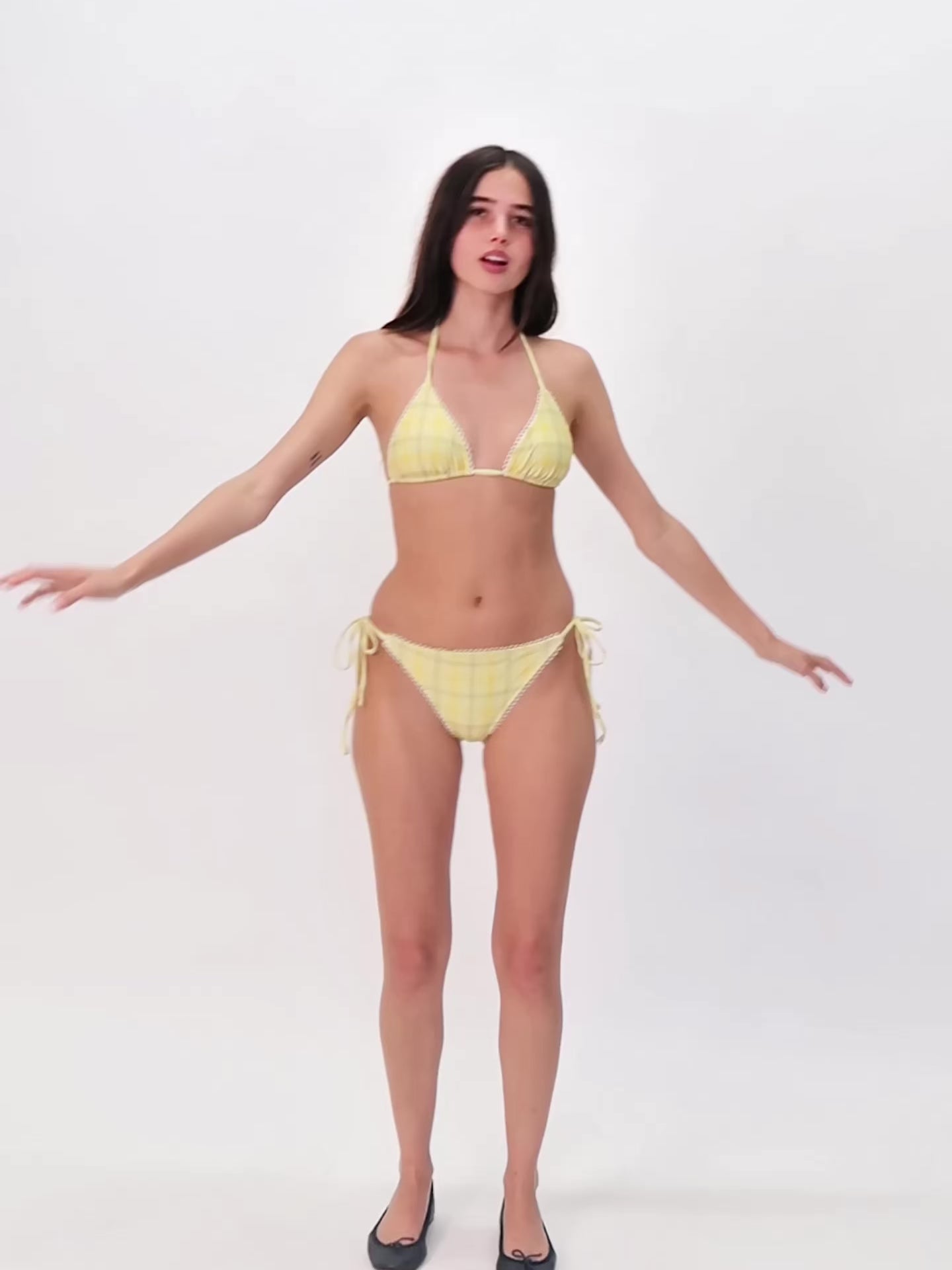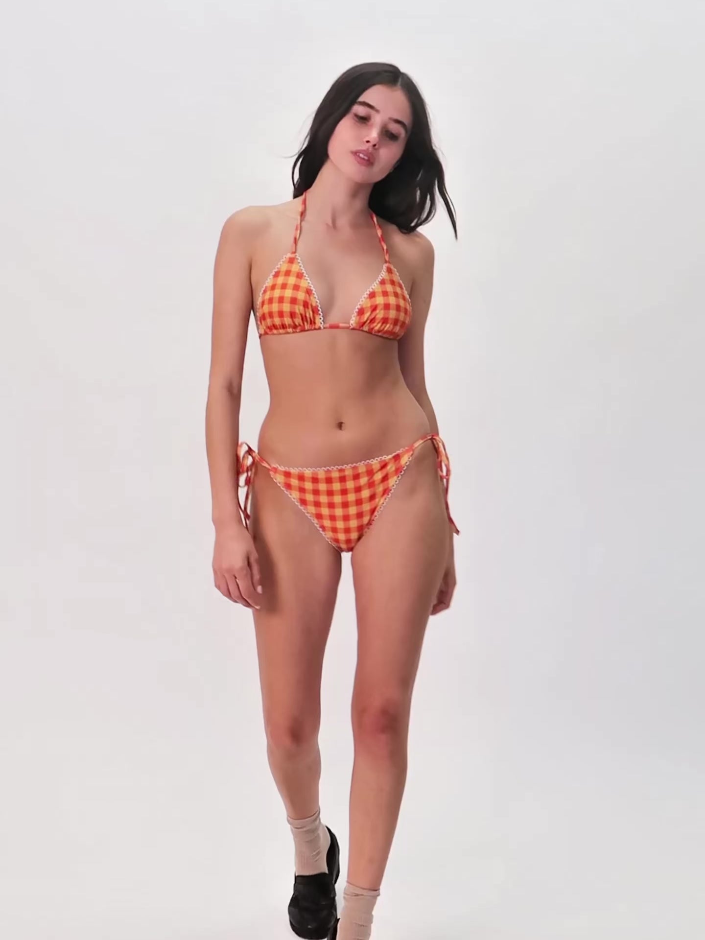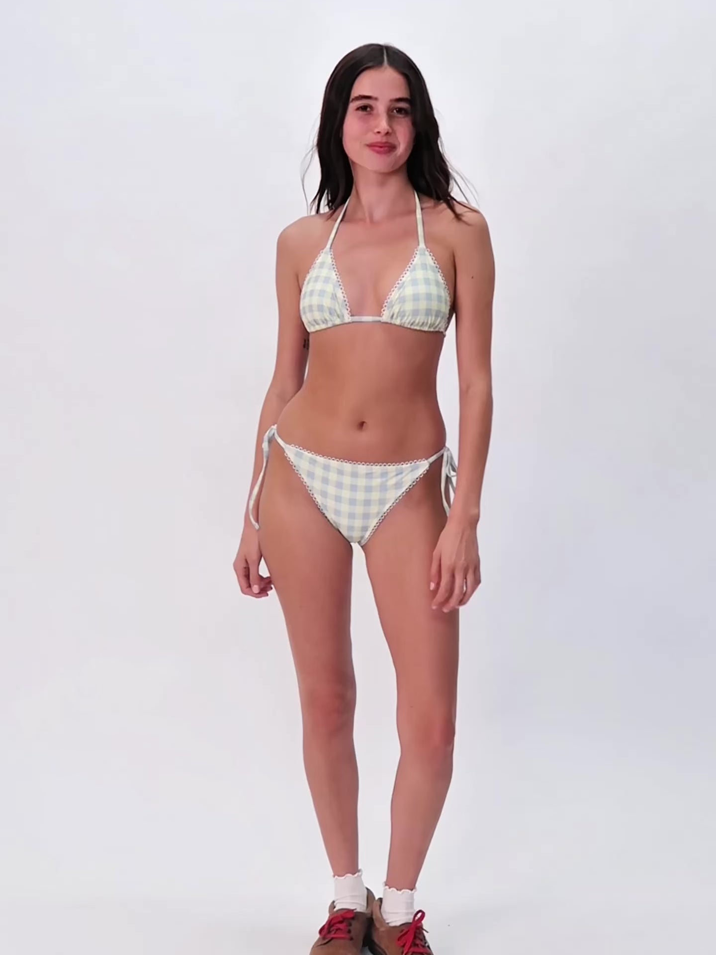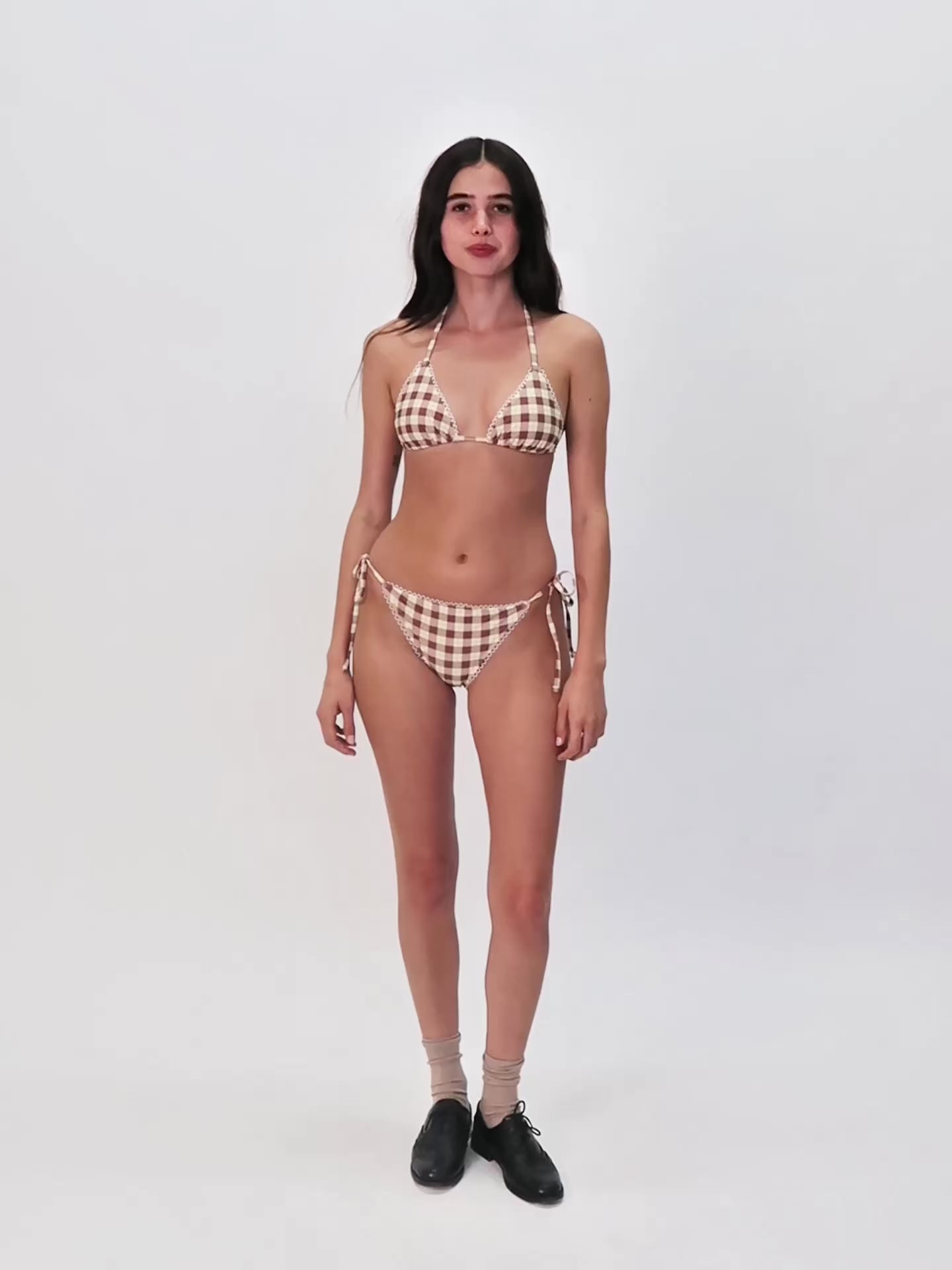 Emilia is 5’5” with a 24” waist, 29” bust, and 35” 1/2 hips. She wears size XS in the Bikini Bottom.