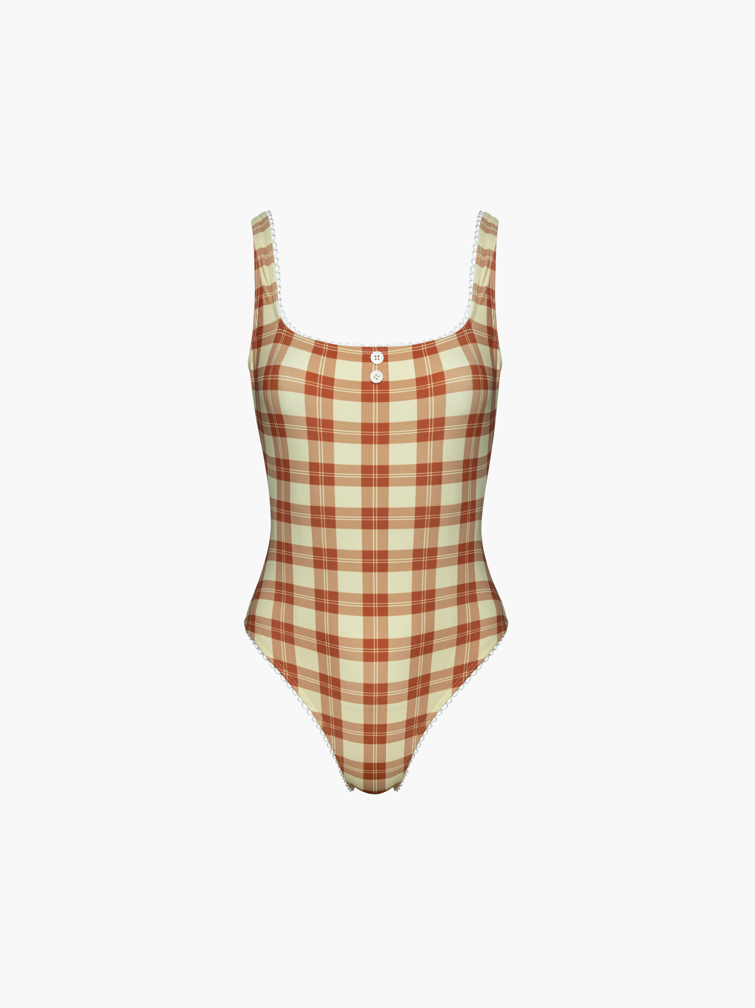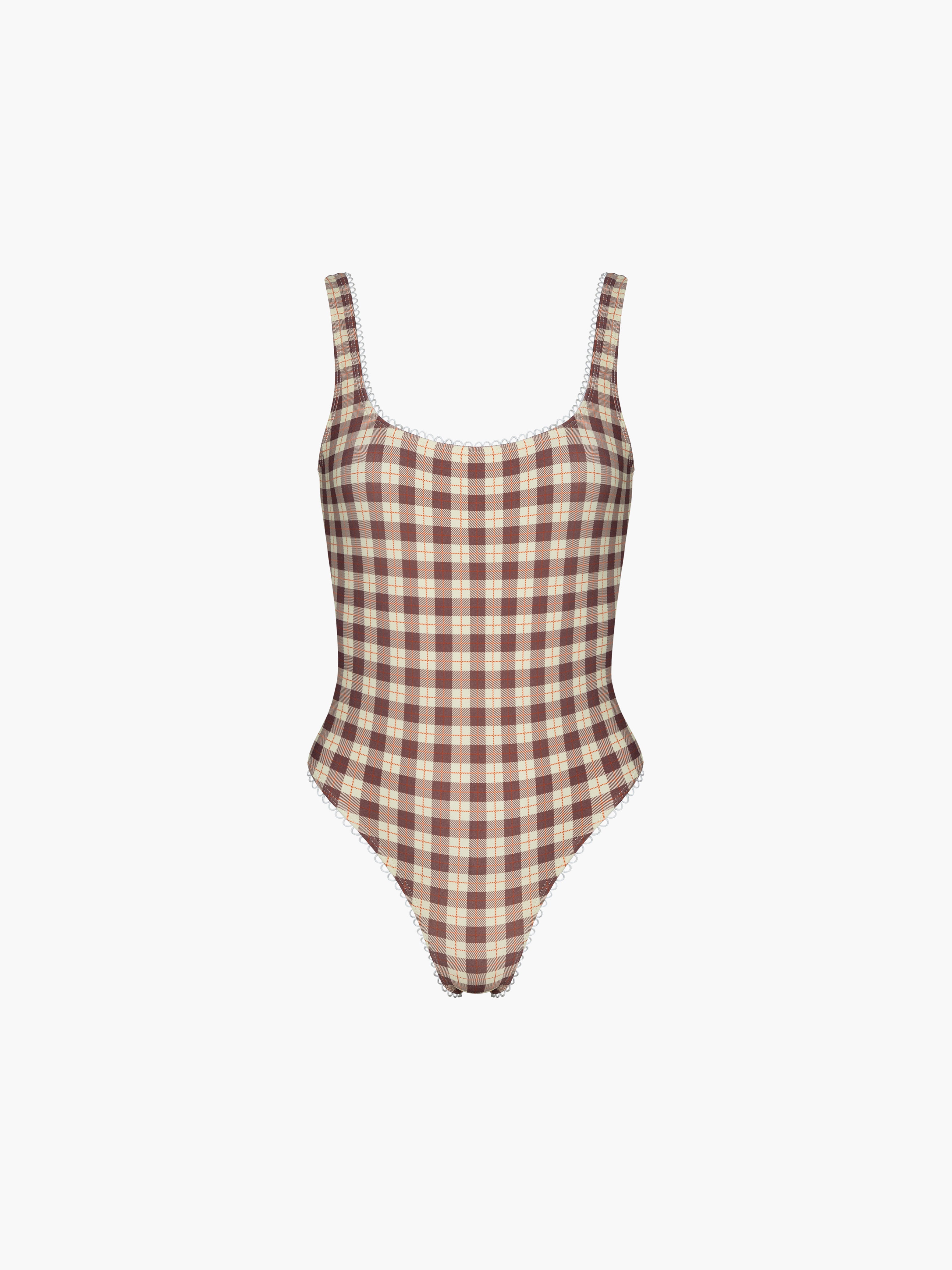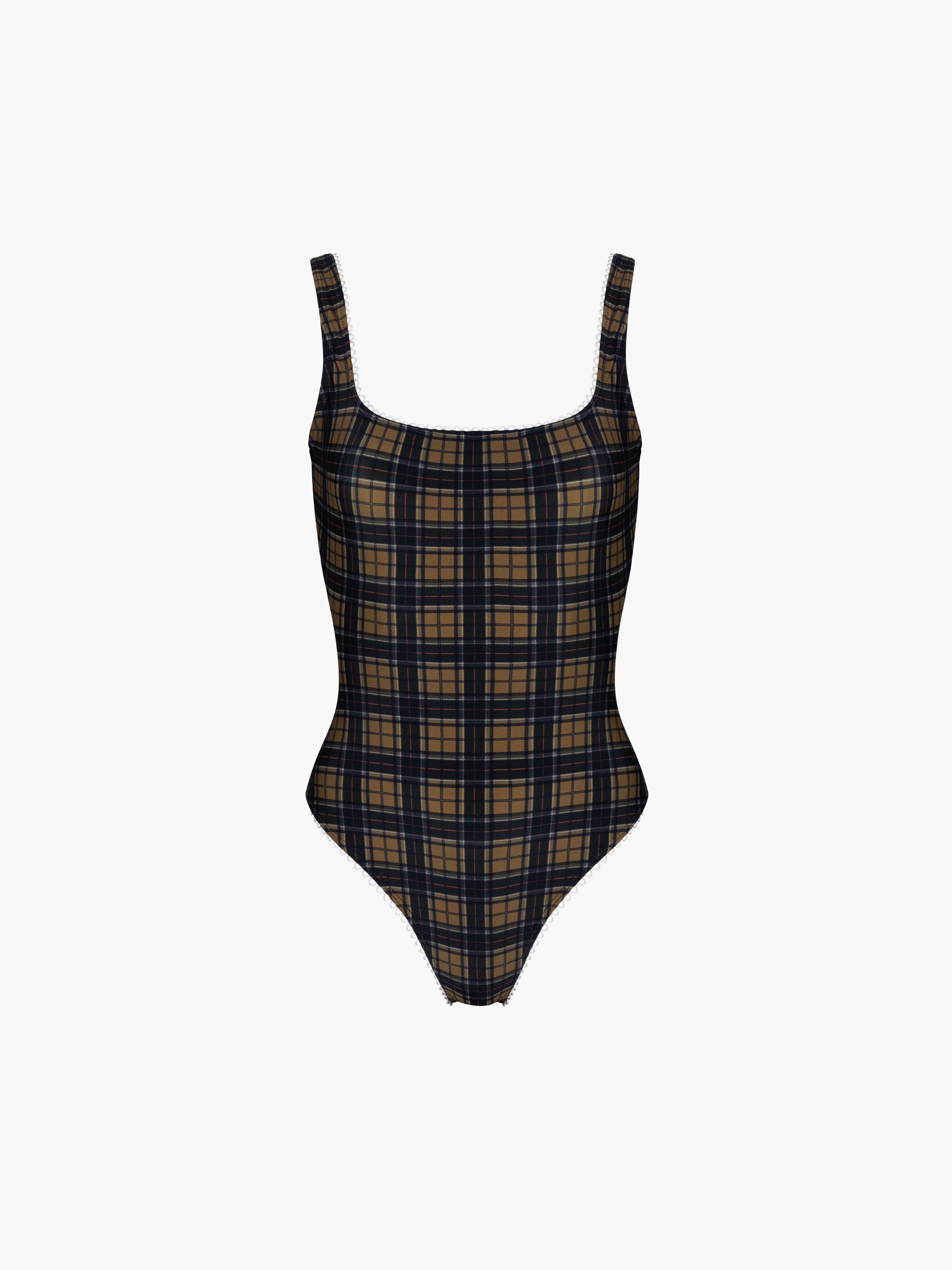 Hand designed custom plaids with the perfect off white lining, low back, and scalloped trim finish. Can also be worn as a body suit.