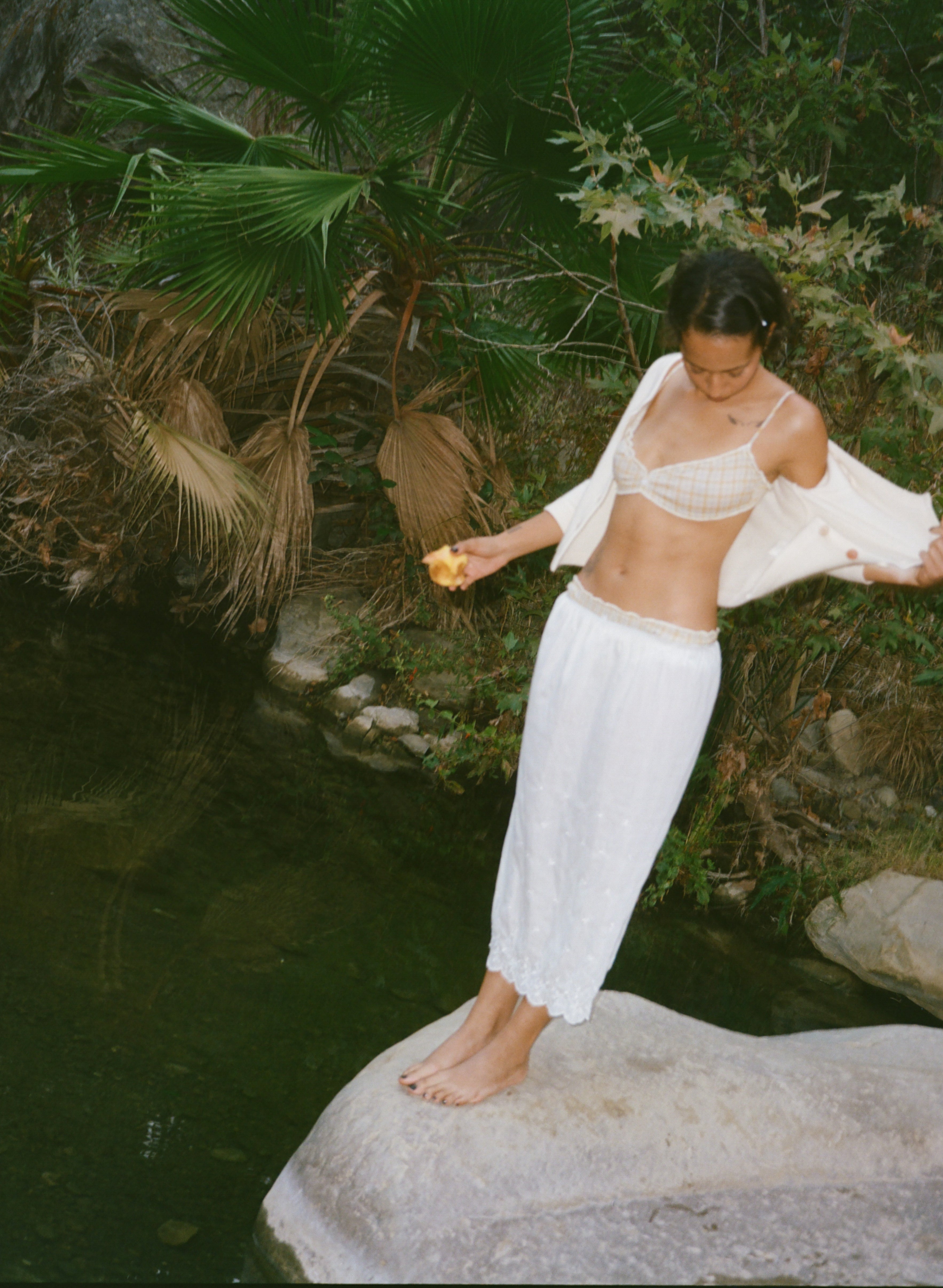 Jensen's plaids hand designed complete with adjustable straps and a ruffled trim. This piece is cut & sewn in downtown Los Angeles. Designed to be worn as a top on its own,  under your favorite cardigan or dress, or however else you may see fit. The back has a clasp for added structure, and the piece is extremely comfortable while maintaining a beautiful shape.